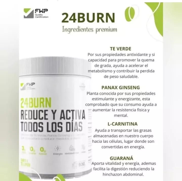 24BURN de FWP es un suplemento diseñado para acompañar a personas que buscan apoyar su metabolismo y mantener un estilo de vida activo. Su fórmula combina ingredientes funcionales que trabajan en sinergia para complementar rutinas de alimentación equilibrada y actividad física.